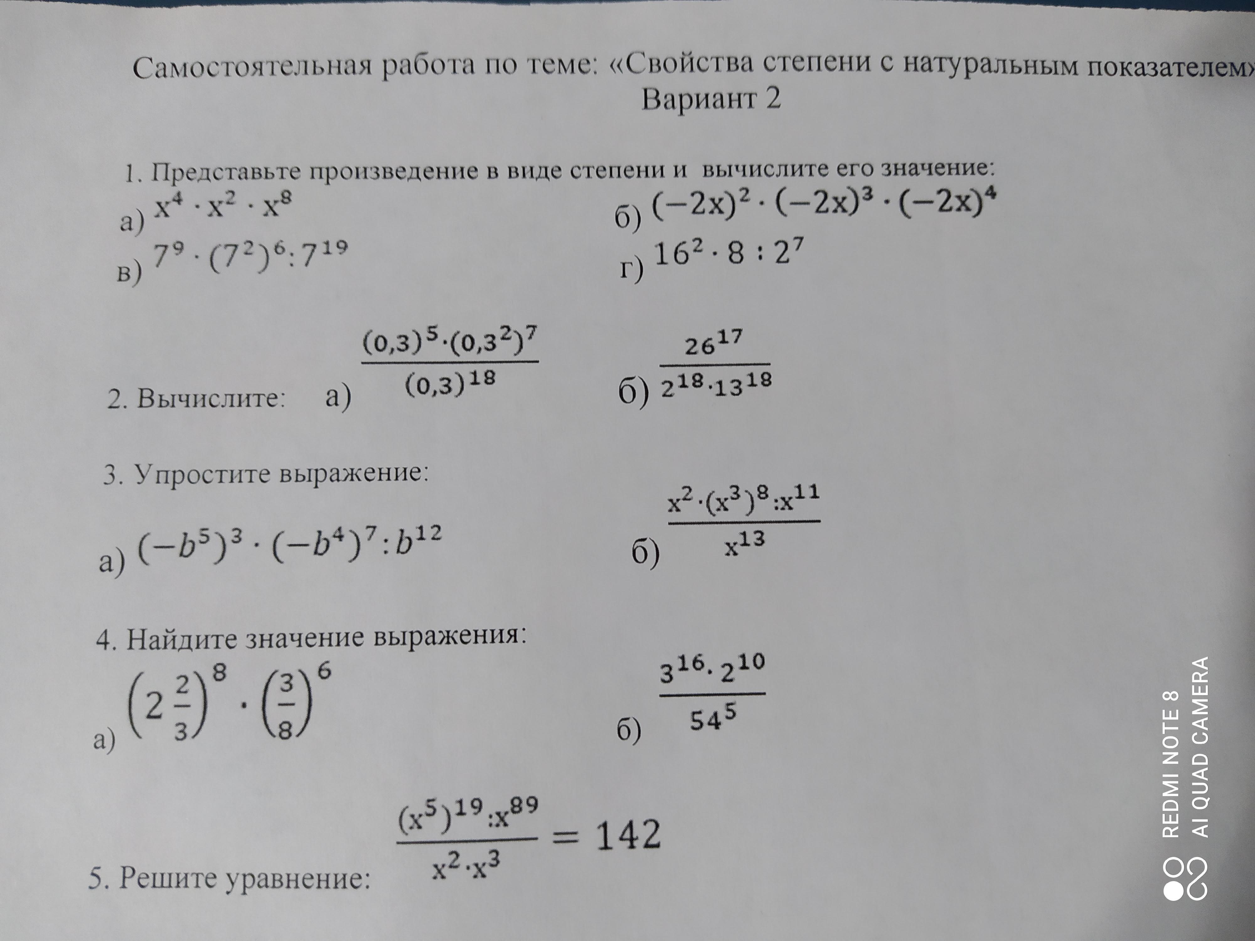 Самостоятельная работа по теме свойства степеней с натуральный показателем вариант-2