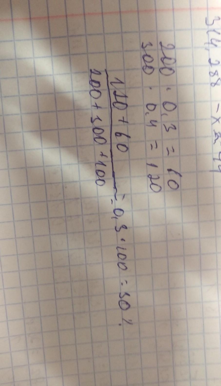 смешаем 200 г 30% раствора соляной кислоты и 300 г 40% раствора затем добавим 100 г воды какой теперь стала массовая доля