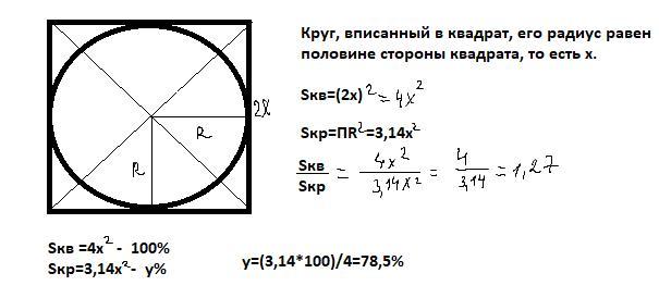 8 На листе квадратной формы начертите круг с наибольшим радиусом. Сторону квадрата обозначьте через 2х. а) Запишите рациональное выражение, которое показывает отношение площади квадрата к площади круга. b) Сколько процентов приблизи- тельно занимает круг на данном листе? Ответ округлите до десятых.
