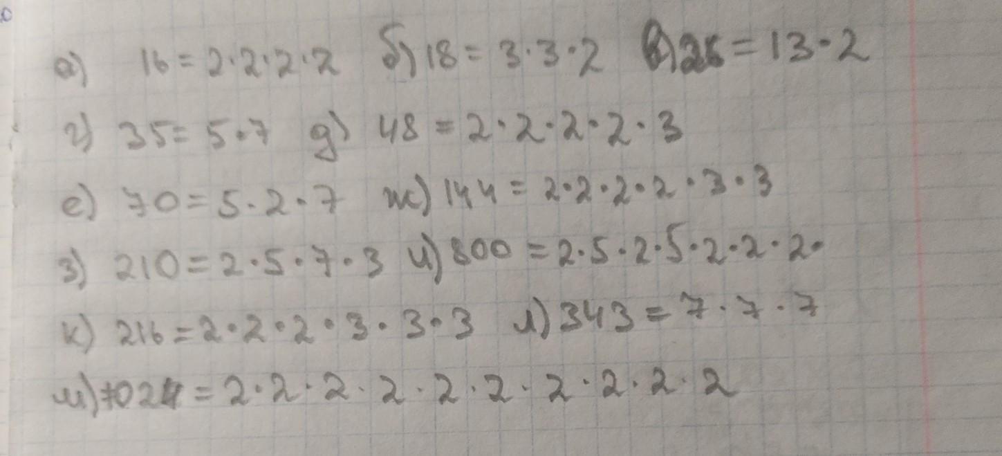 разложите на простые множители число:а)16 б)18 в)26 г)35 д)48 е)70 ж)144 з)210 и)800 к)216 л)343 м)1024