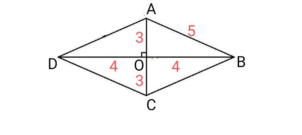 Пусть ABCD - ромб, О - точка пересечения его диагоналей, тогда ∆ АОВ прямоугольный, АО = 1/2 • АС = 1/2 • 6 = 3 (см), ВО = 1/2 • BD = 1/2 • 8 = 4 (см).