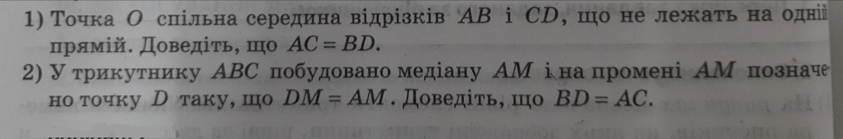 2 ) MC = MB ; MA = MD - за побудовою , а ∠AМC = ∠DMB - як вертикальні кути , тому за І ознакою рівності тр - ків ΔАМС =ΔDMB .