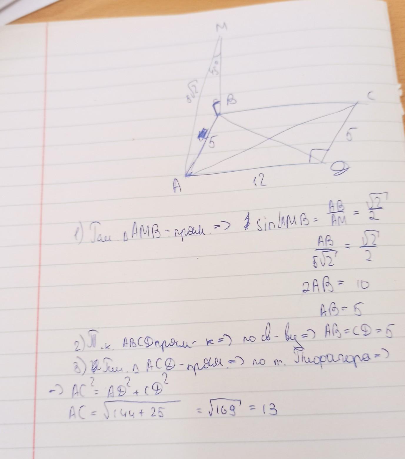 AD=BC=12, тогда по т. Пифагора АС=√(АВ²+ВС²)=√(12²+5²)=13 ед.