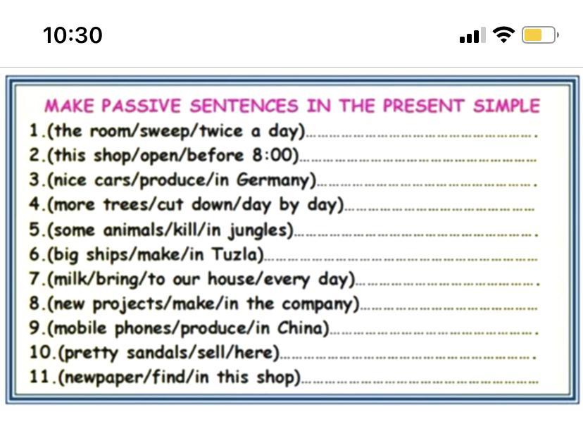 The room is sweeped twice a day. This shop is opened before 8:00. Nice cars are produced in Germany. И тд.