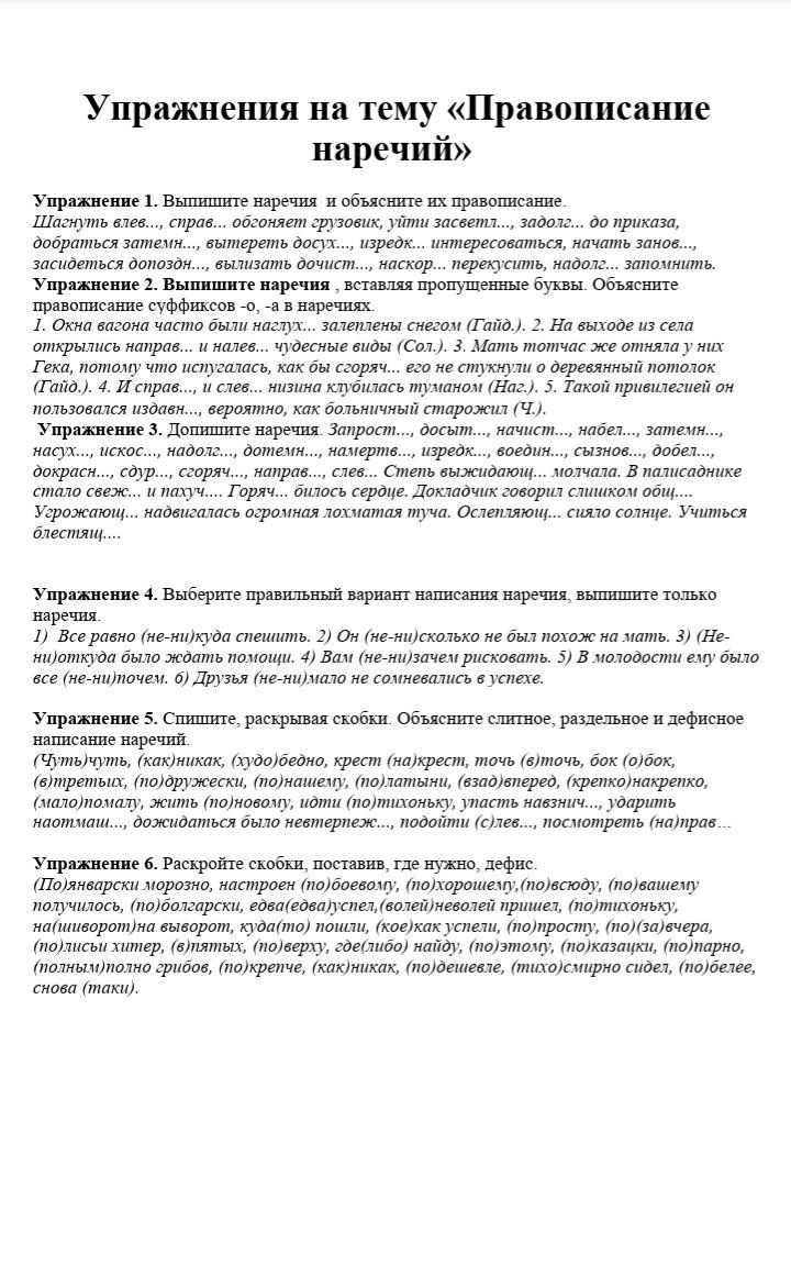 Чуть-чуть,как-никак, худо-бедно , крест-накрест , точь-в-точь, бок-о-бок, в-третьих, по-дружески,по-латыни, по-нашему, взад-вперёд , крепко-накрепко , мало-помалу , жить по-новому, идти потихоньку, упаси навзничь, ударить наотмашь, дожидаться было не в терпёжь , подойти слева , посмотреть на право.