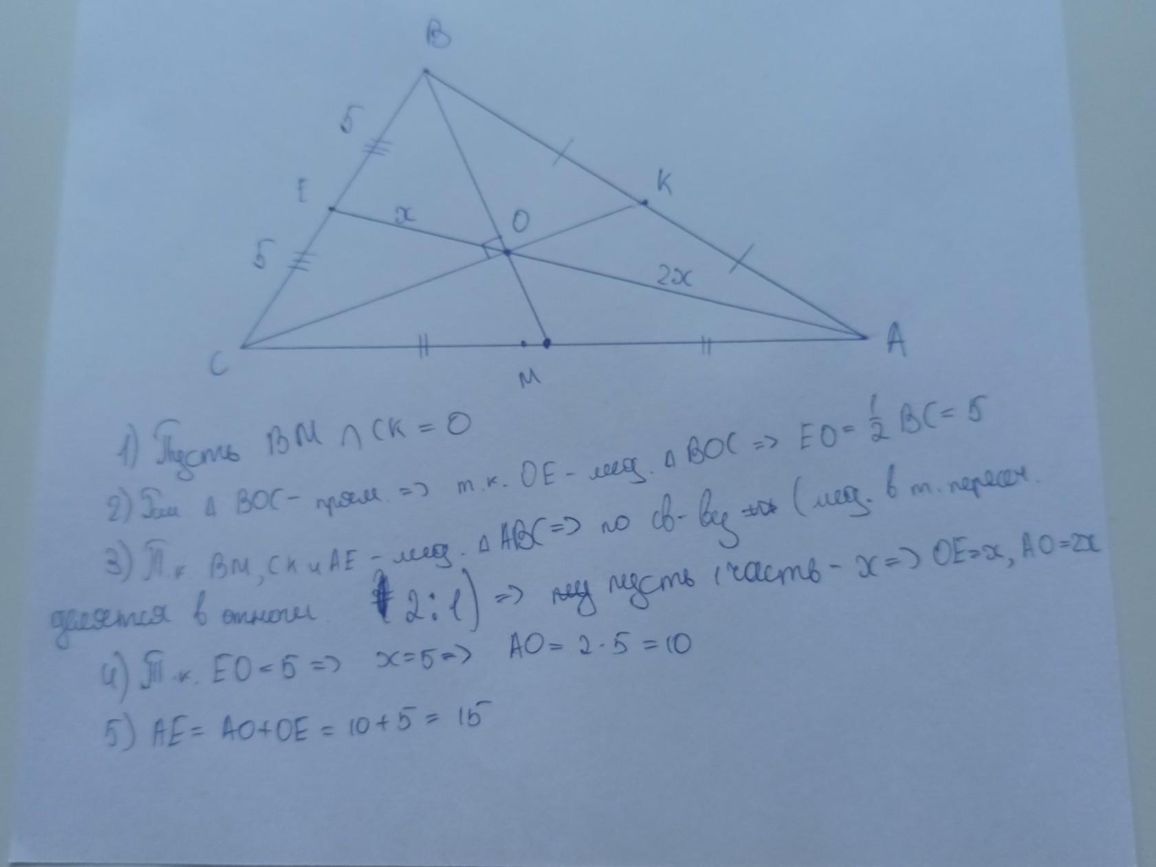 Медианы вм и ск треугольника ABC перпендикулярны. Найдите медиану AE, если ВС = 10 см.