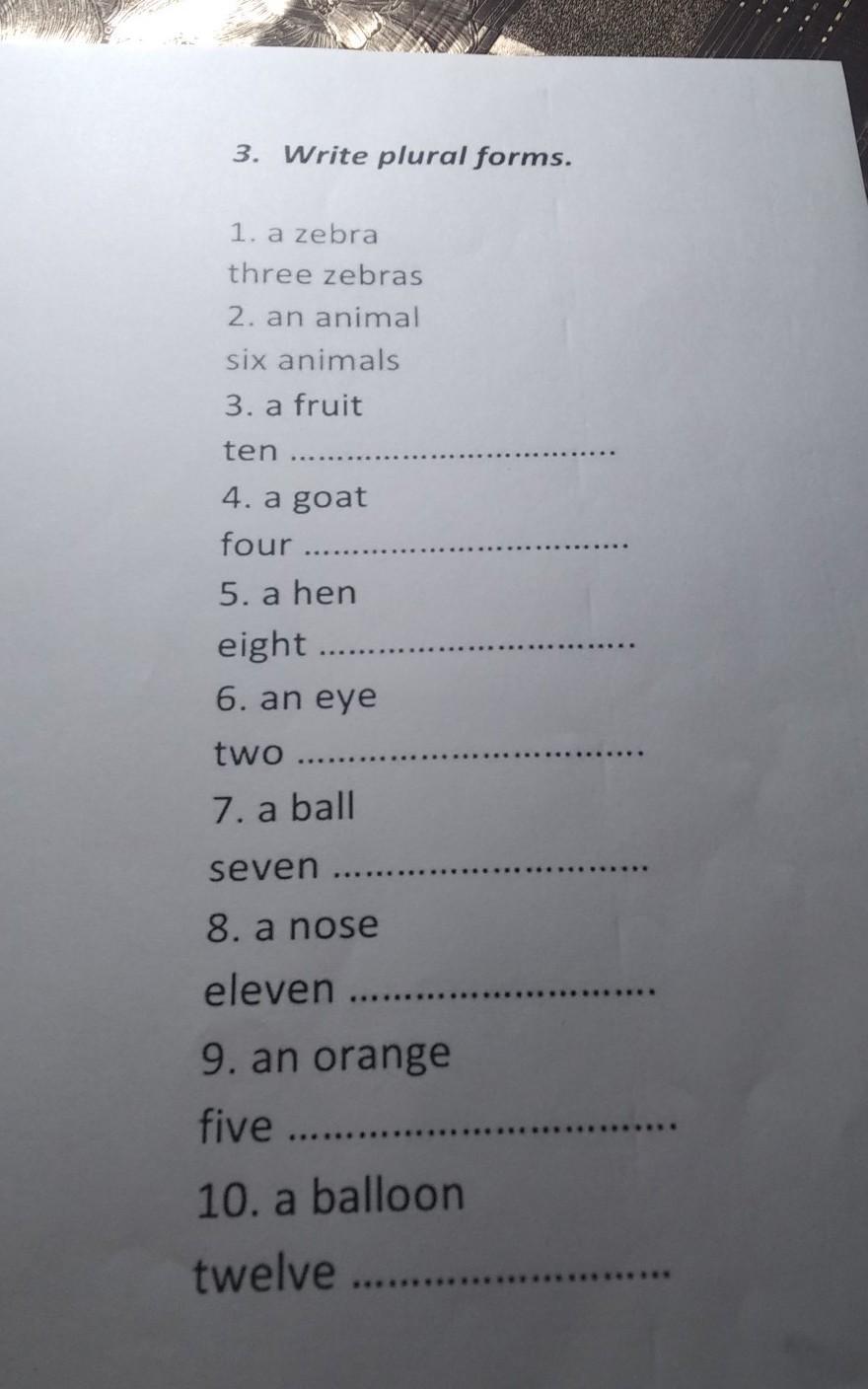 ten fruits, four goats, eight hens, two eyes, seven balls, eleven noses, five orange, twelve balloons