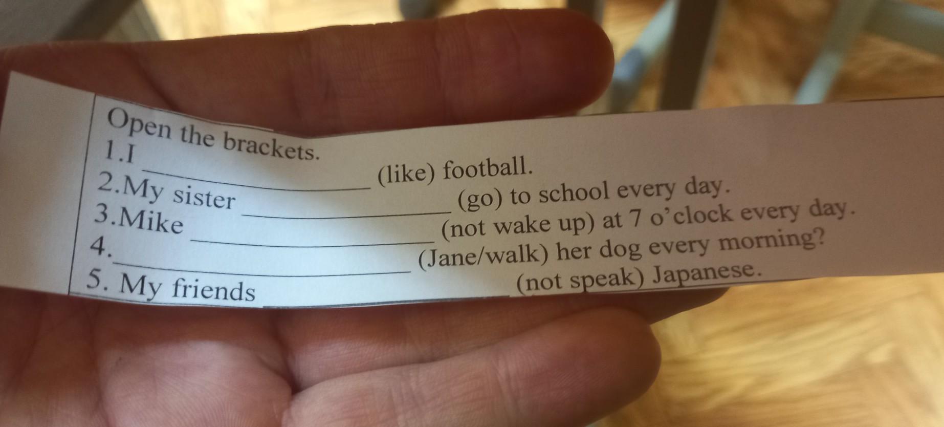 СРОЧНО ПЖП 2 My sister 3. Mike 4 S. My friends (like) football. (go) to school every day. (not wake up) at 7 o'clock every day. (Jane/walk) her dog every morning? (not speak) Japanese.