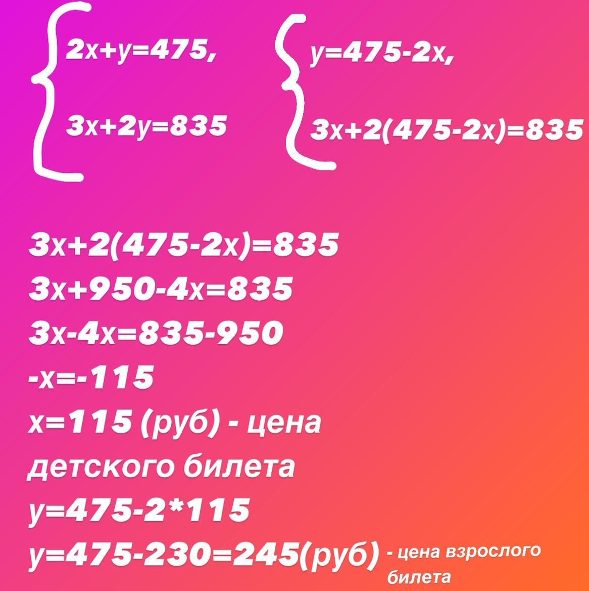 Две семьи отправились на детский утренник. Первая семья купила два детских билета и один взрослый и всего заплатила 475 рублей. Вторая семья купила три детских билета и два взрослых и всего заплатила 835 рублей. Сколько стоит один детский билет и сколько стоит один взрослый билет?