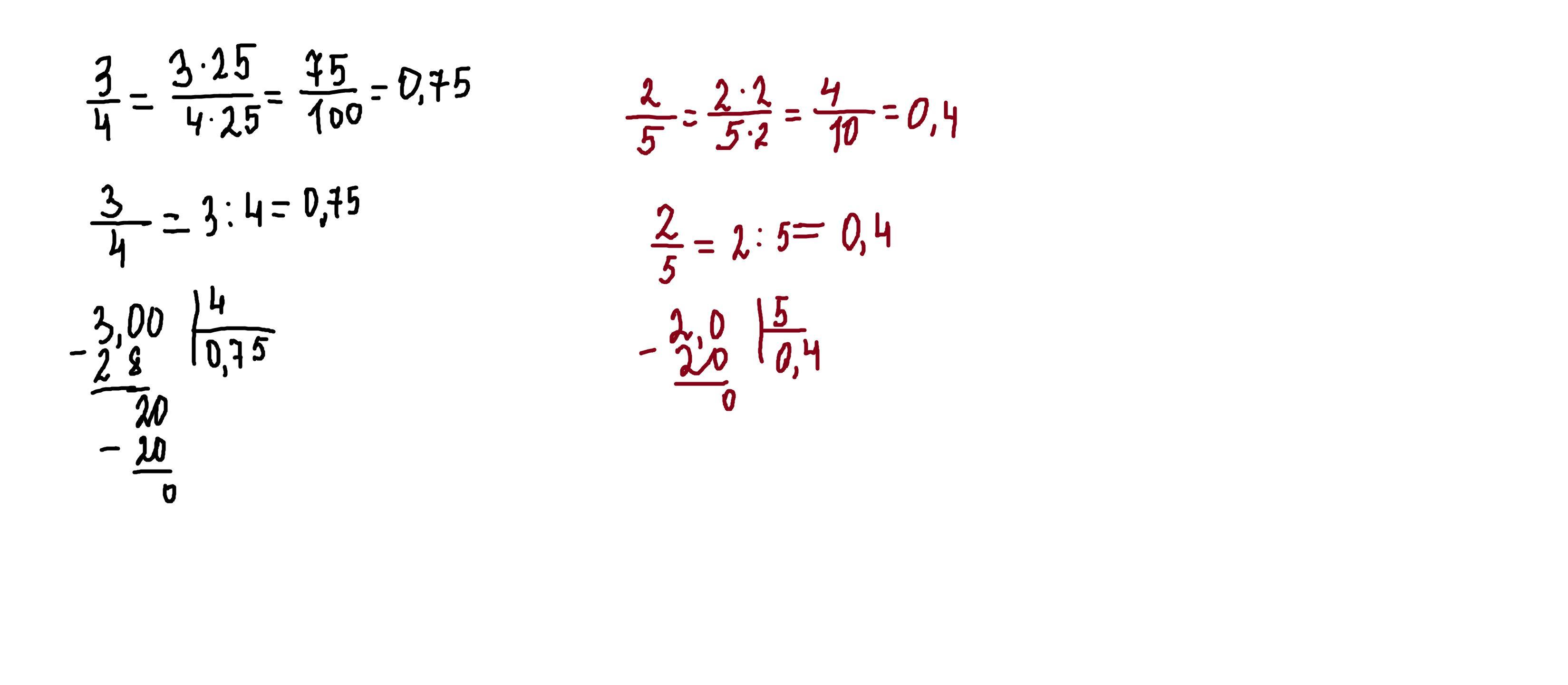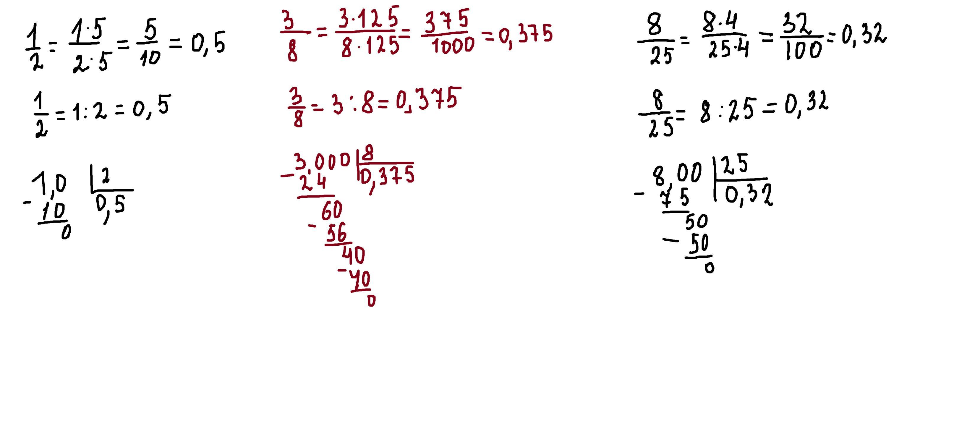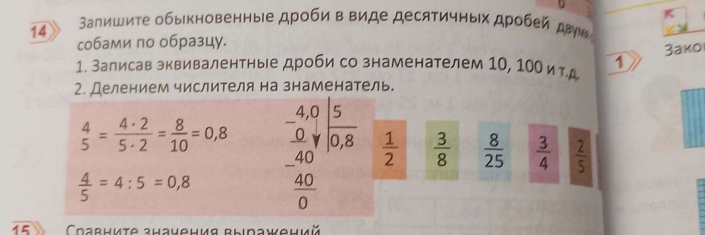 0 Запишите обыкновенные дроби в виде десятичных дробей двую собами по образцу. 1. Записав эквивалентные дроби со знаменателем 10, 100 и т.д. 2. Делением числителя на знаменатель. 4,0 5 4 4.2 8 0,8 о 1 3 8 3 5 5.2 10 40 2 8 25 4 4 = 4:5 = 0,8 40 5 о = Оy |0,8 с