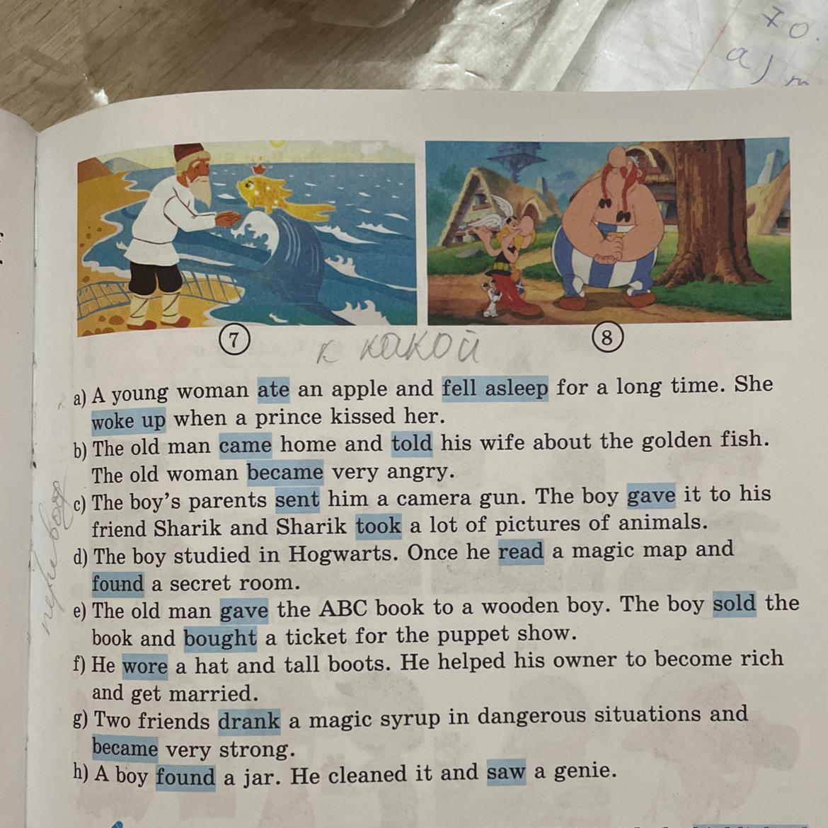b) Старик пришел домой и рассказал жене о золотой рыбке. Старуха очень рассердилась. (Ответ:7; Сказка о рыбаке и рыбке-The Tale of the Fisherman and the Fish)