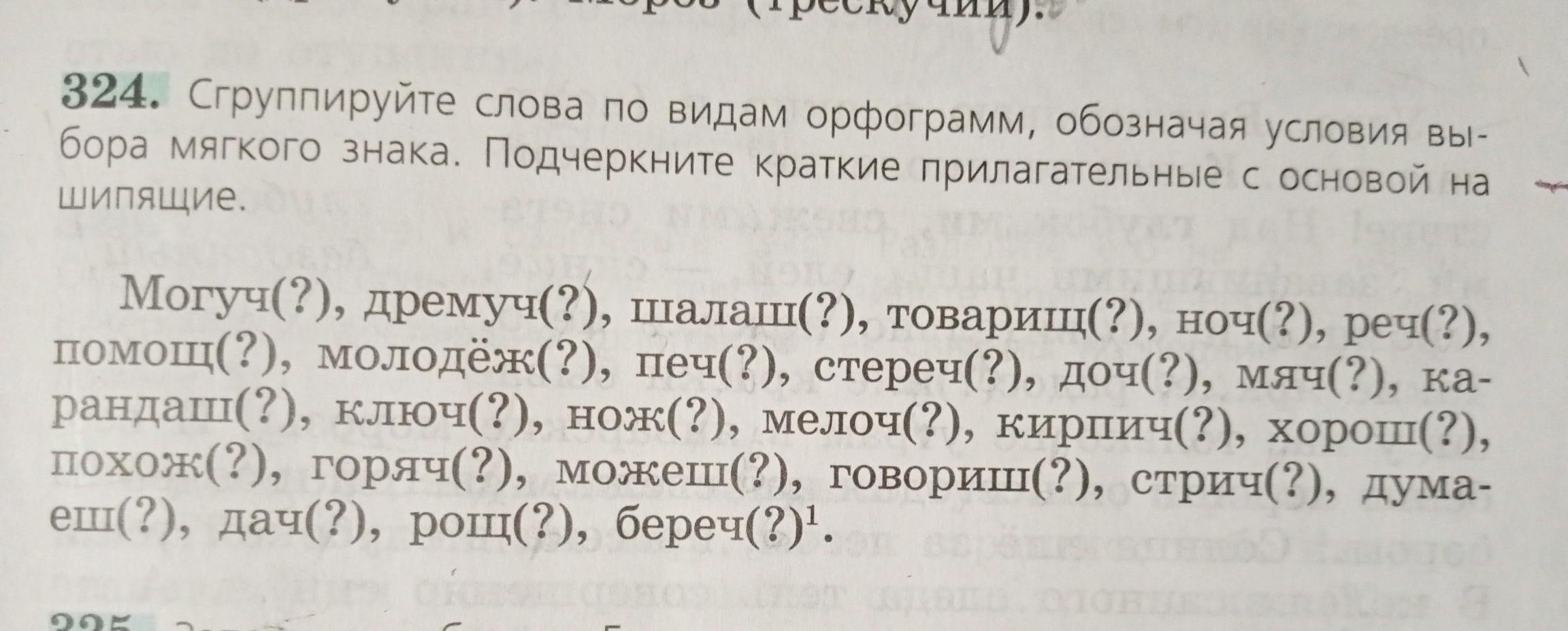 Могуч, дремуч, шалаш, товарищ, ночь, речь, помощь, молодёжь, печь, стеречь, дочь, мяч, карандаш, ключ, нож, мелочь, кирпич, хорош, похож, можешь, горяч, говоришь, стричь, думаешь, дача, роща, беречь