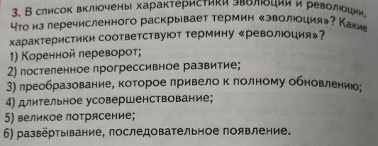 номер 3 в список характеристики эволюции и революции. Что из перечисленного раскрывает термин ЭВОЛЮЦИЯ ? Какие характеристики соответствуют термину РЕВОЛЮЦИЯ ?