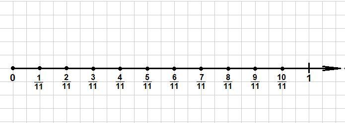 На координатном луче с единичным отрезком, равным 22 клеткам, отметьте дроби: 1/11 2/11 3/11 4/11 5/11 6/11 7/11 8/11 9/11 10/11