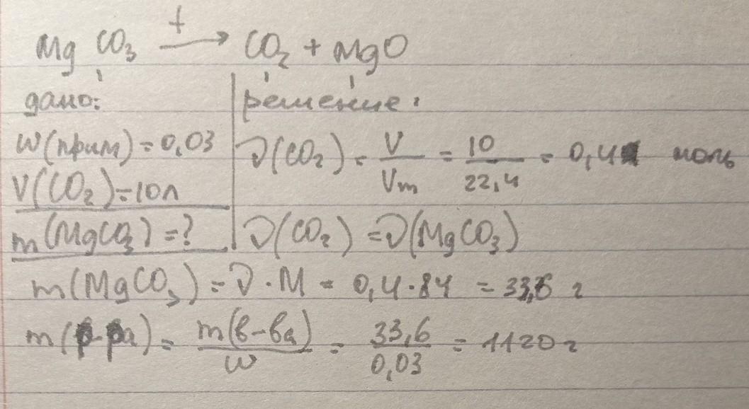 при нагревании разлагается карбонат магния при этом получают 10 л углекислого газа в исходном карбонате магния было 3 % примесей найти общую массу карбоната магния
