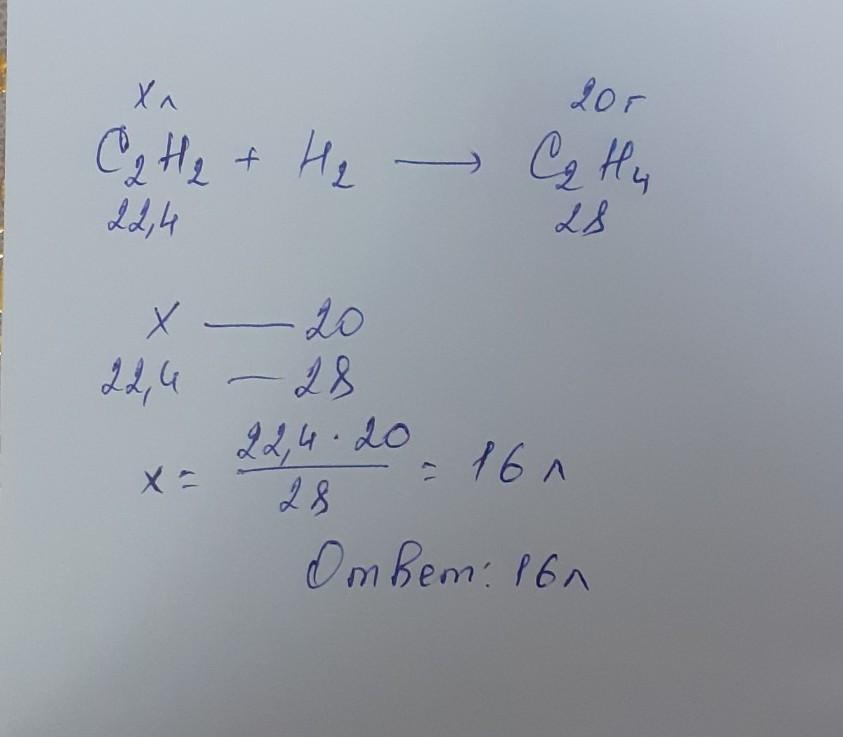 Решите задачу. Какой объём ацетилена (н. у.) должен вступить в реакцию с водородом, чтобы получить 20 г этилена?