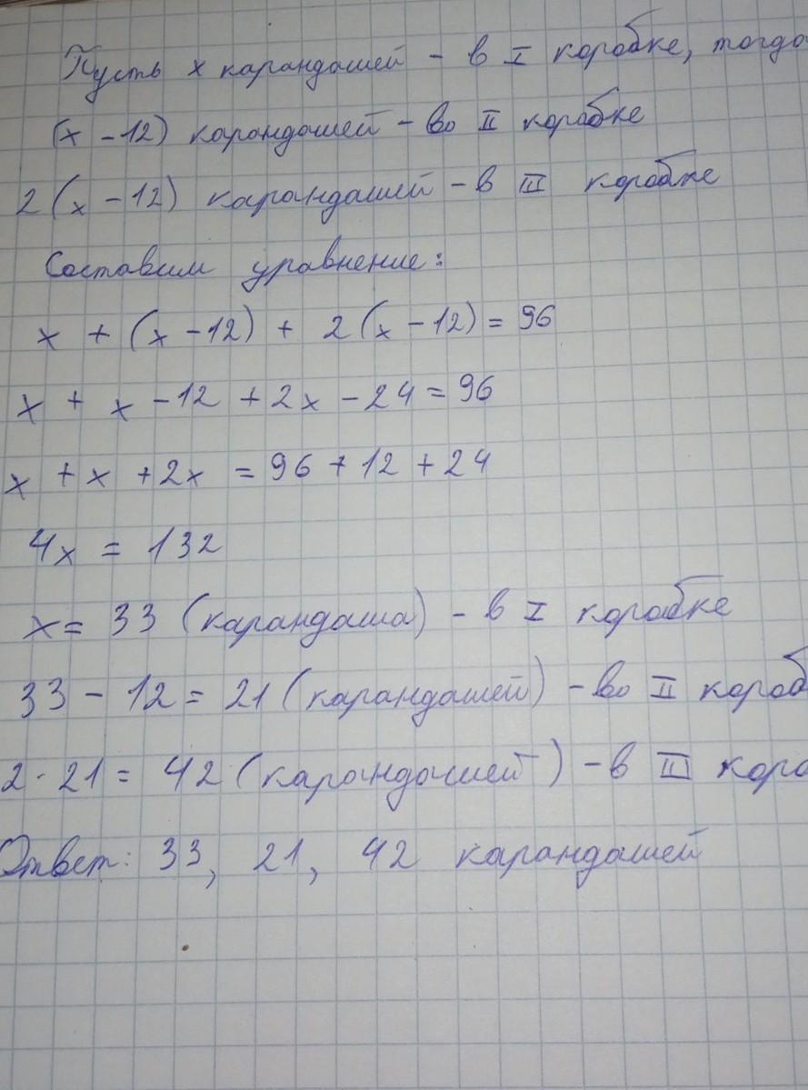 в 3 коробках 96 карандашей. Во второй коробке на 12 карандашей меньше, чем в первой, а в третьей в 2 раза больше , чем во второй, сколько карандашей в каждой коробке?