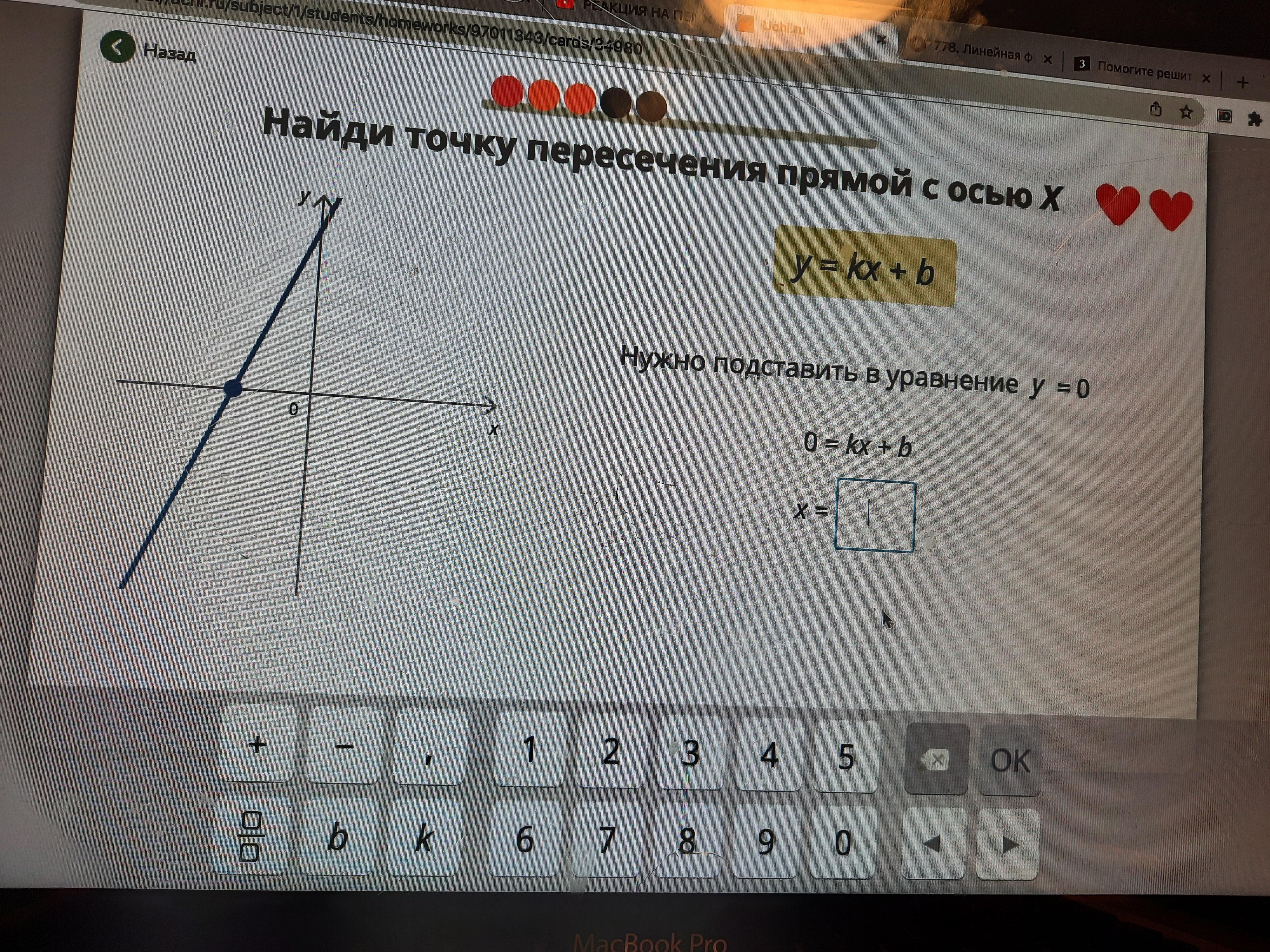Т. к. точка находится на оси ОХ, то у=0, т. е 0=kx+b ⇒ kx= -b, x= -b/k