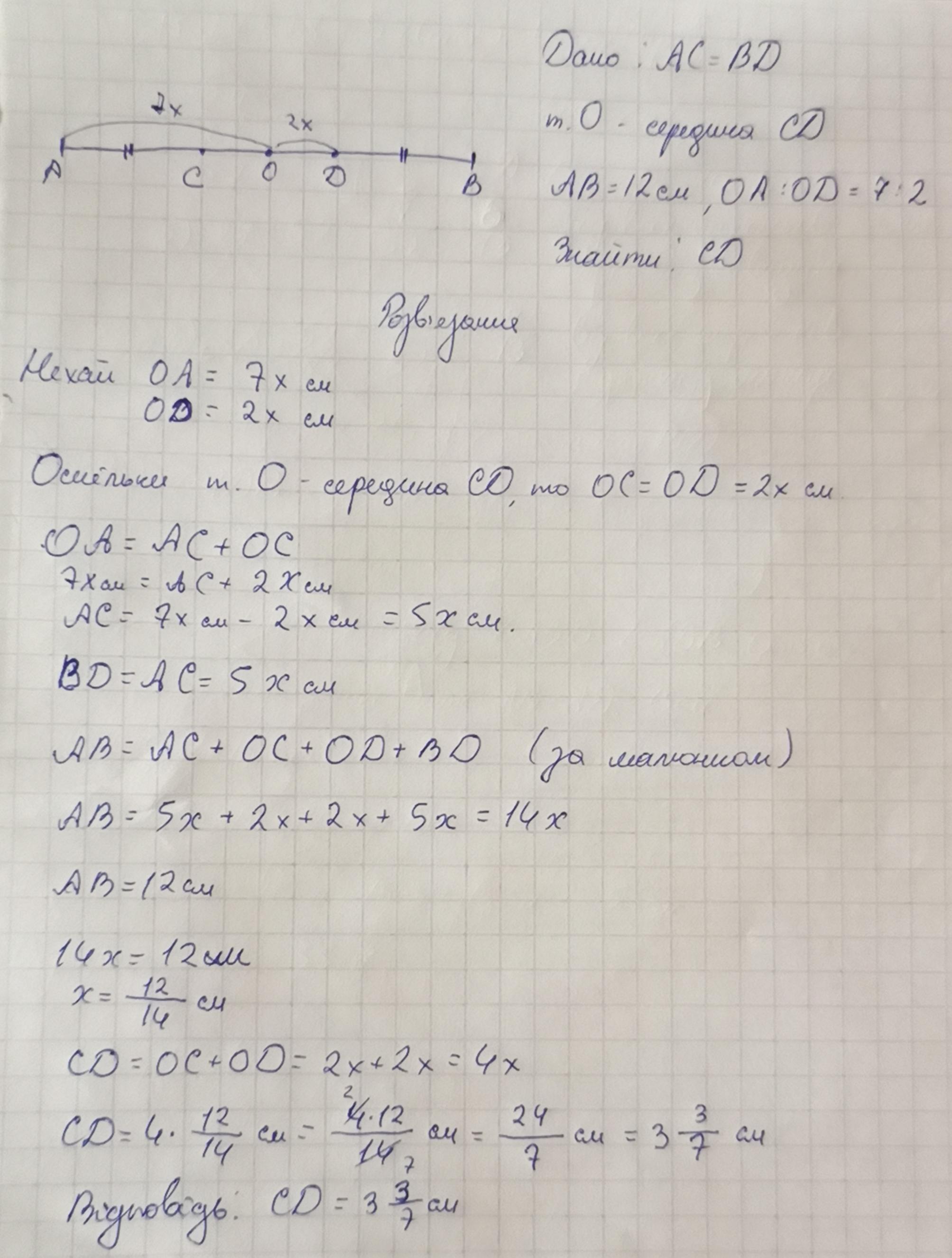На відрізку АВ позначили точки С і D так, що АС = BD. Точка О — середина відрізка СD. Знайдіть відстань між точками С і D, якщо АВ = 12 см, ОА : ОD = 7 : 2. Помогите пожалуйста! Геометрия 7 класс