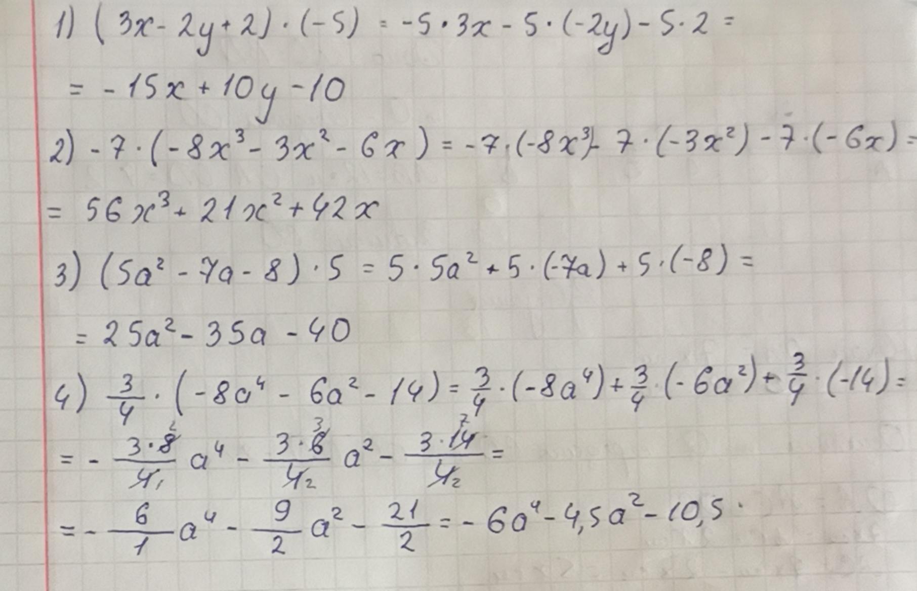 найдите произведение одночлена и многочлена 1)(3x-2y+2)×(-5); 2) -7×(-8x^3-3x^2-6x); 3) (5a^2-7a-8)×5 ;4) 3/4×(-8a^4-6a^2-14)