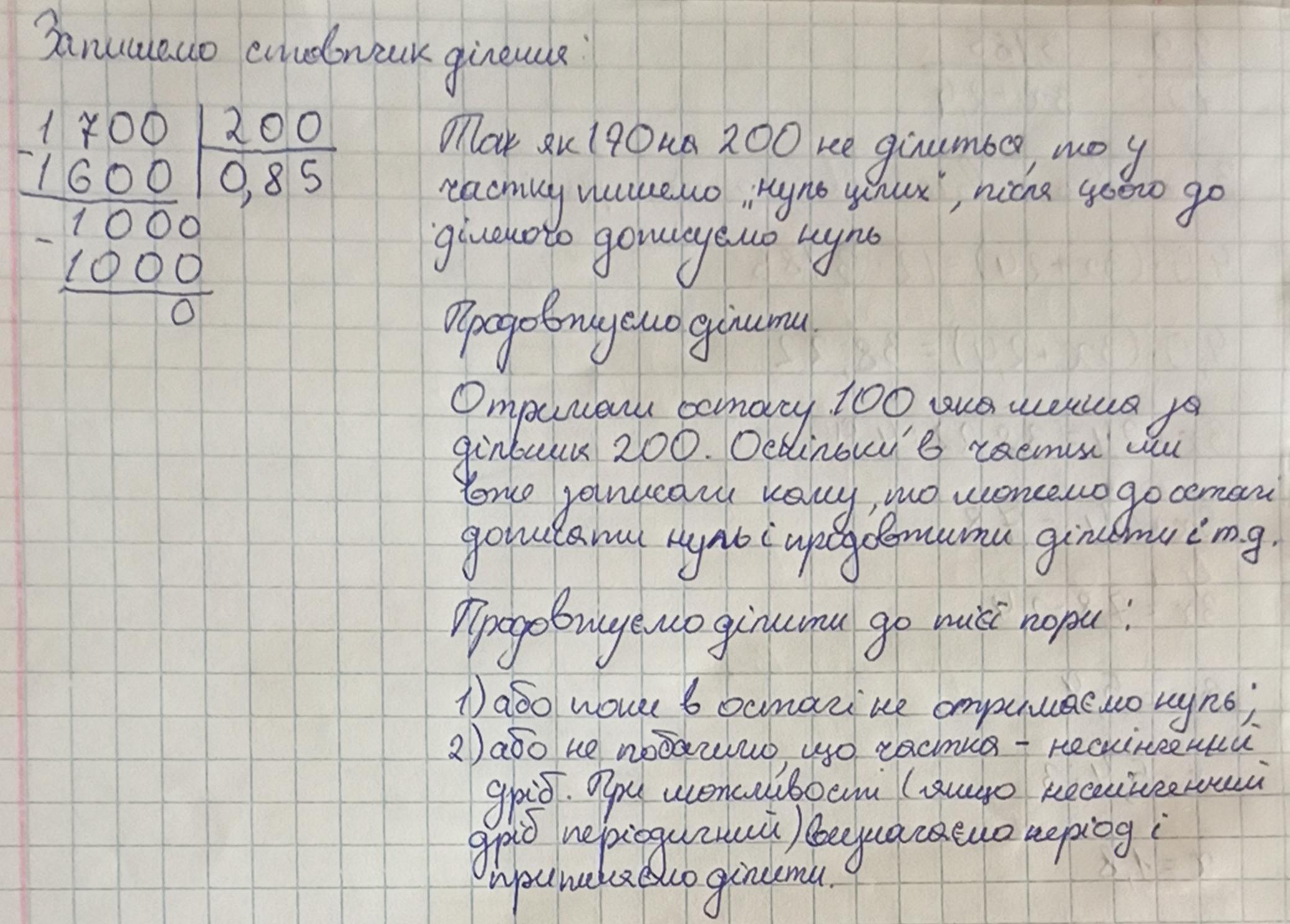 170:200 пишем ноль в ответе и поставляємо ноль в 170 получается 1700 потом ми делаем подбор 1700 .Берем по 8 1700-1600=100 дописиваем снова ноль 1000:200=5 С ето ва ми получаем 0.85