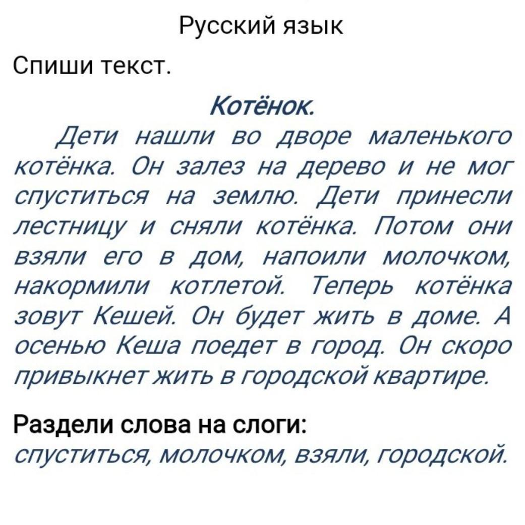 Дети нашли во дворе маленького котёнка .Он залез на дерево и не мог спуститься на землю .Дети принесли лестницу и сняли котёнка .Потом они взяли его в дом, напоили молочком ,накормили котлетой .Теперь котёнка зовут Кешей .Он будет жить в доме. А осенью Кеша поедет в город .Он скоро привыкнет жить в городской квартире .