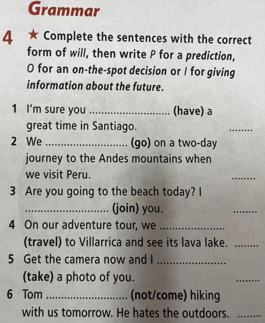 complete the sentences with the correct form of will, then write P for a prediction, O for an on-the+-spot decision or/for giving information about the future. Помогите пожалуйста!!!!!