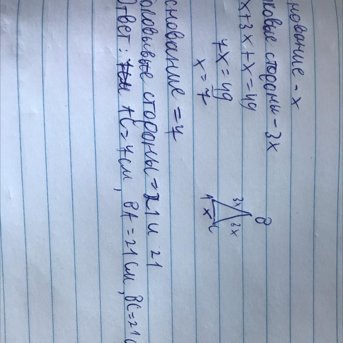 в равнобедренном треугольнике боковые стороны в 3 раза больше основания периметр 49см найдите всё стороны треугольника