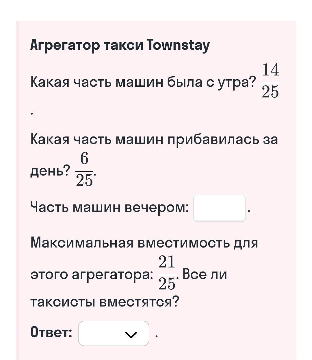 14/25 + 6/25 = 20/25-часть машин вечером.