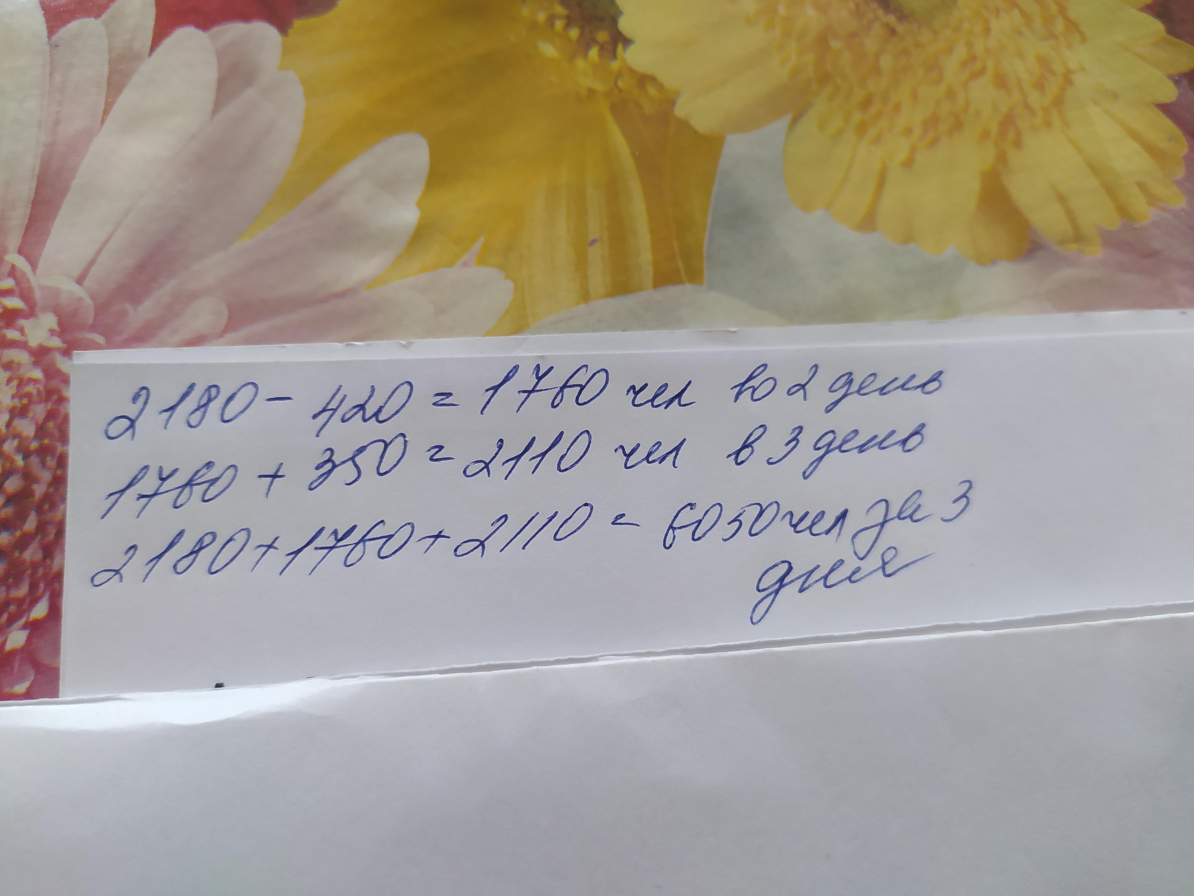 3 В первый день музей Амира Темура посетили 2180 человек, во второй день на 420 человек меньше, чем в первый день, а в третий день на 350 человек больше, чем во второй день. Сколько человек посетили музей за три дня? пояснения и выражение напишите пожалуйста