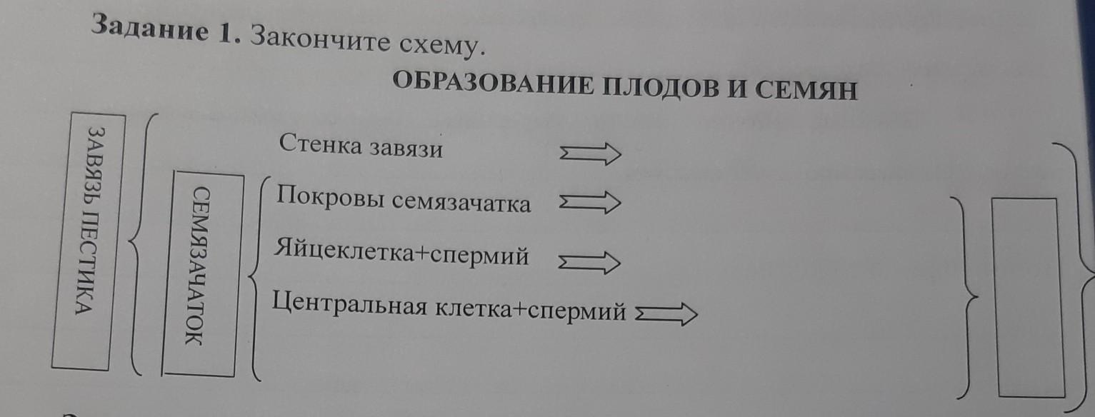 (маленькая фигурная скобка) покровы семязачатка, яйцеклетка + спермий, центральная клетка + спермий - образуют семя