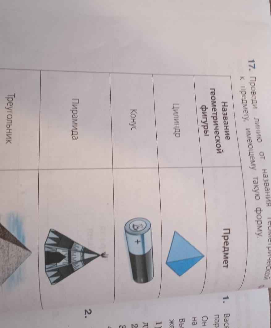 геометрической ОТ 17. Проведи линию названия к предмету, имеющему такую форму. Предмет 1. Название геометрической фигуры Вася C паралле Он рас на рис Выбери жения Цилиндр Конус 1) вь дра, 2) м 3) п 4) м Пирамида 2. Запи две Треугольник
