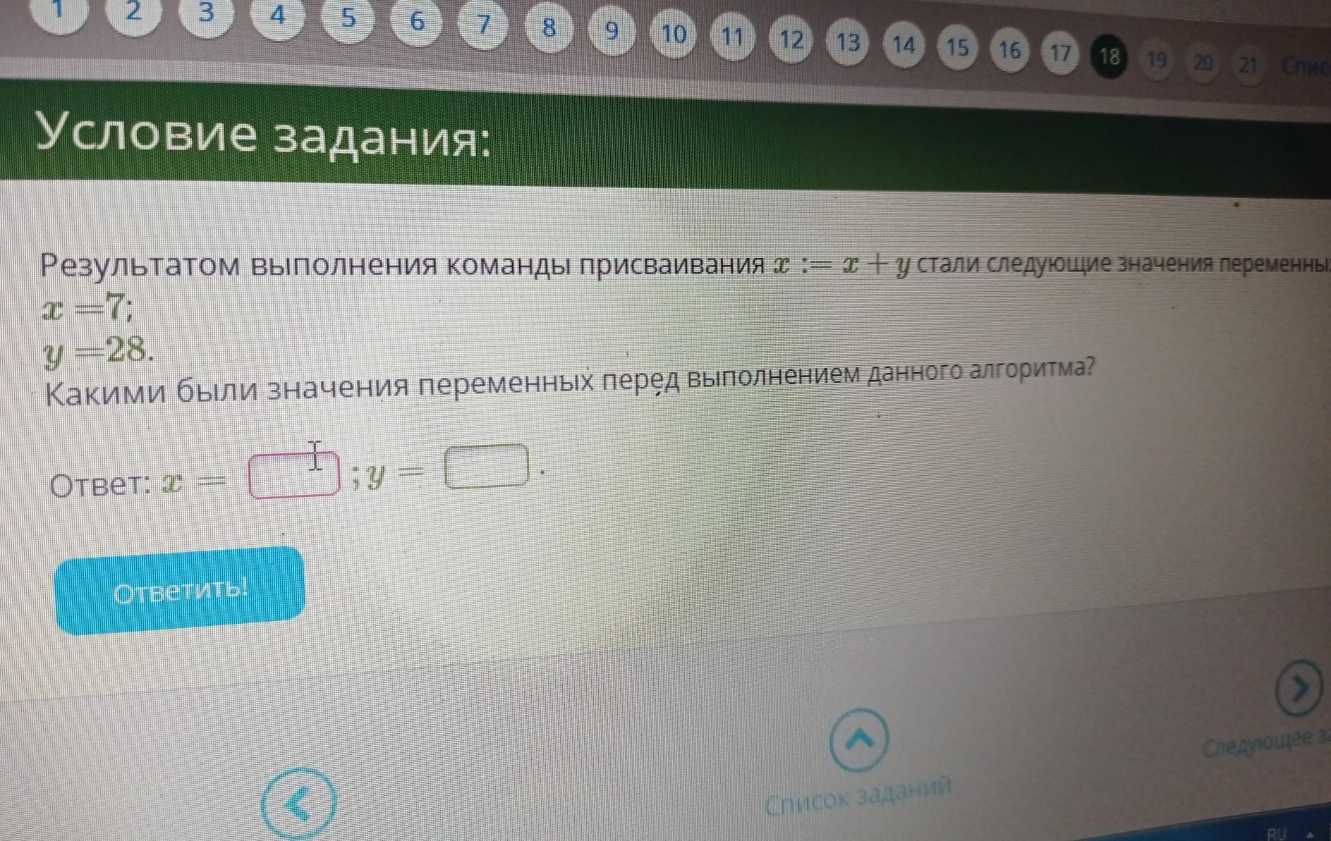 Объяснение: Оператор присваивания не означает "равно". Он присваивает значение. Итоговое значение x = 7, значит подставляем в сумму(левую часть). Далее имеем: 7:=x+y. Мы знаем итоговое значение y. Оно равно 28, следовательно, 7:=x+28. Переносим математически как уравнение и получаем 7 -28 = х. Итог: -21 = х, отсюда, x = -21
