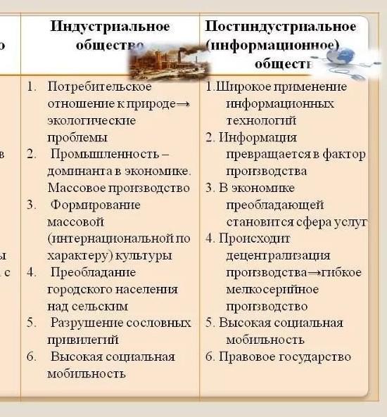 1. В постиндустриальном об-ве главную роль начинает играть наука и новые технологии, развивается сфера услуг, на производстве работают не люди, а машины, а в индустриальном все сосредоточено на промышленности
