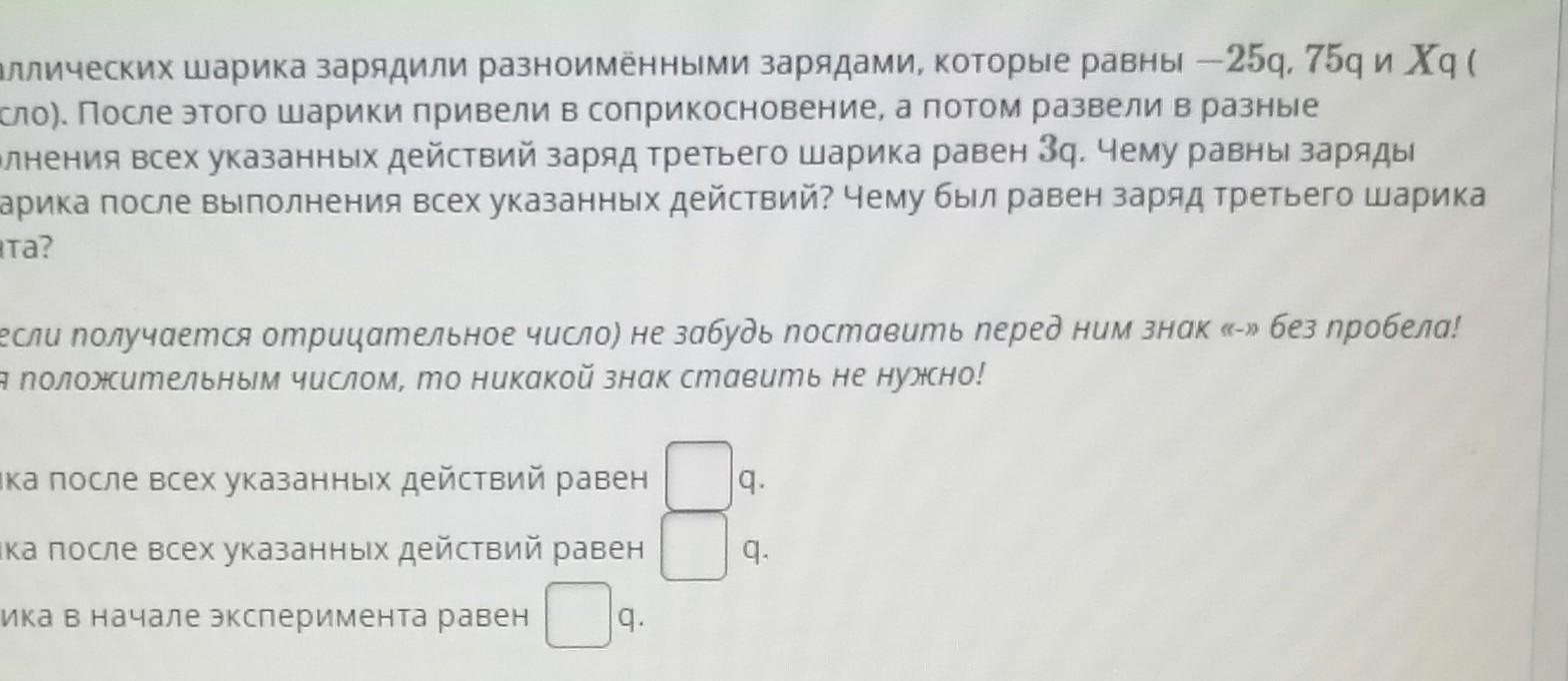 Три одинаковых металлических шарика зарядили разноимёнными зарядами, которые равны - 25q. 75g и Хq ( - х - неизвестное число). После этого шарики привели в соприкосновение, а потом развели в разные стороны.