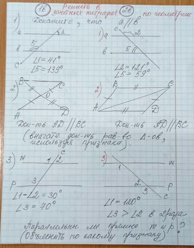 3)Параллельны, т.к. смежный с углом 1 угол = 60 градусам(угол 4), предположив что прямые параллельны делаем следующий вывод: угол 4 = углу 2, т.к. накрест лежащие, т.к. угол 2 = 60 градусам - следует, что угол смежный с ним = 120 градусам ( угол 5), т.к. угол 5 = 120 следует что угол 3 = 120 градусам, так как углы вертикальные. Из условия следует что угол 3 в 2 раза больше угла 2, следовательно - прямая м параллельна прямой р