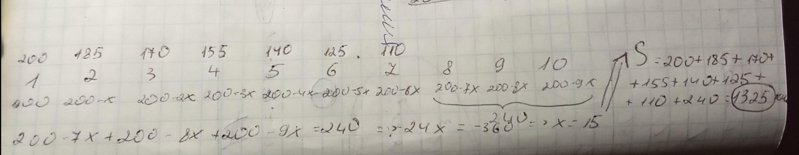 S₁₀=(2*200-9*15))*10/2=(400-135)*5=265*5=1325/км/