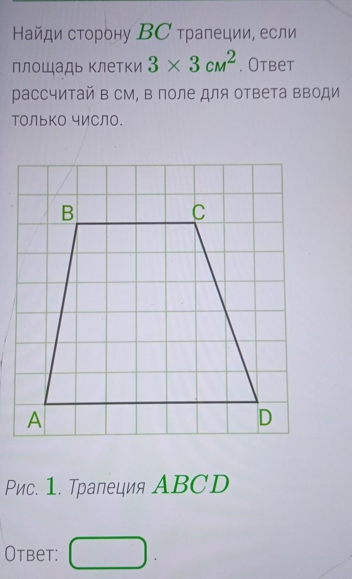 Найди сторону BC трапеции если площадь клетки 3 на 3 квадратных см ответ Посчитай в сантиметрах ответ ,в поле для ответа вводи только число