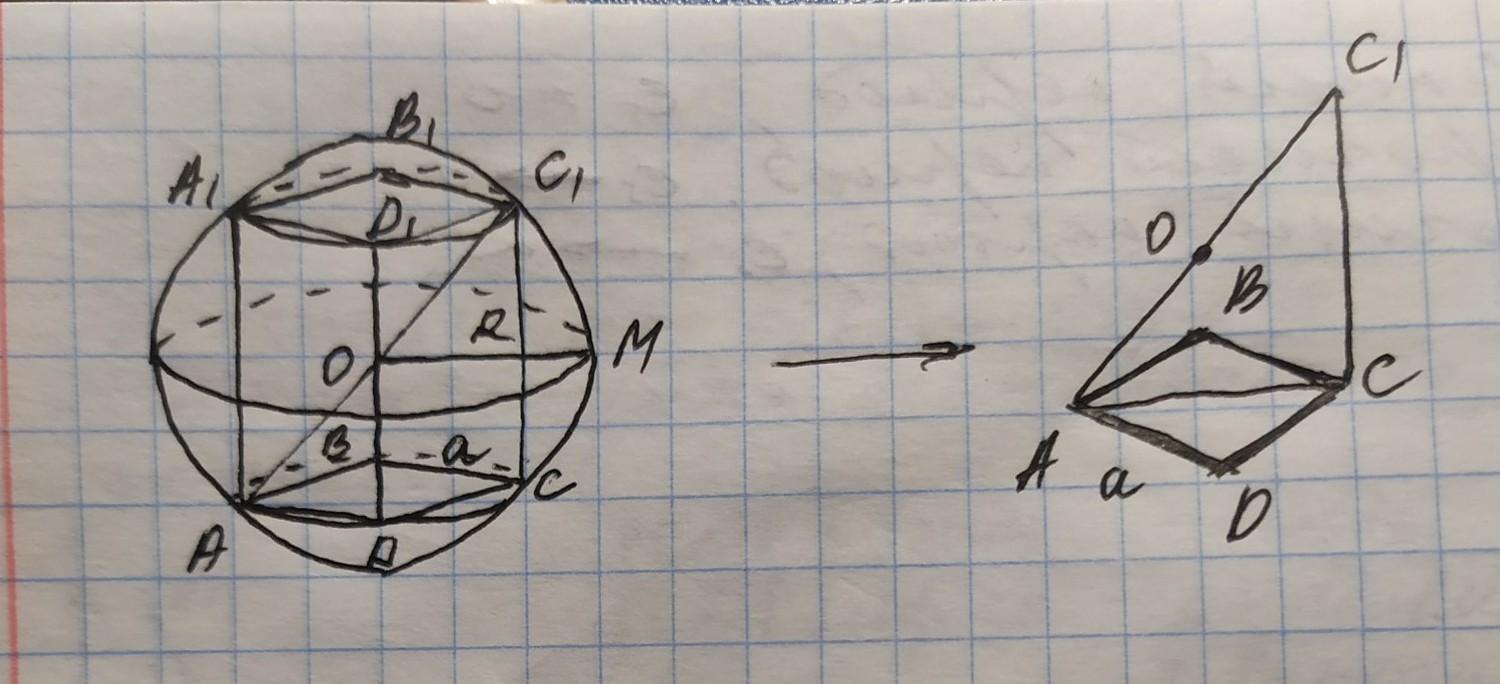 Рассмотрим треугольник АСС1, где С1О=ОА как радиусы описанного шара, то есть АС1=2R.