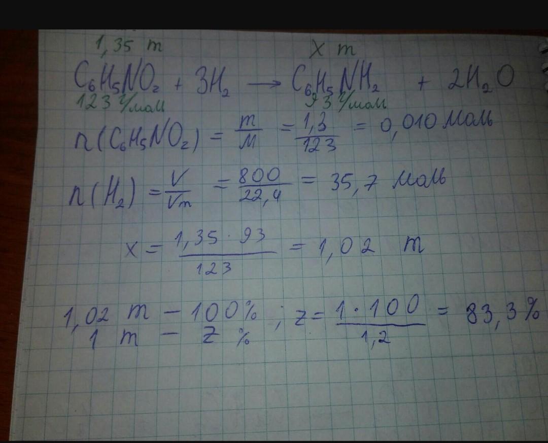 Для виробництва аніліну масою 1 т затратили нітробензен масою 1,35 т та водень