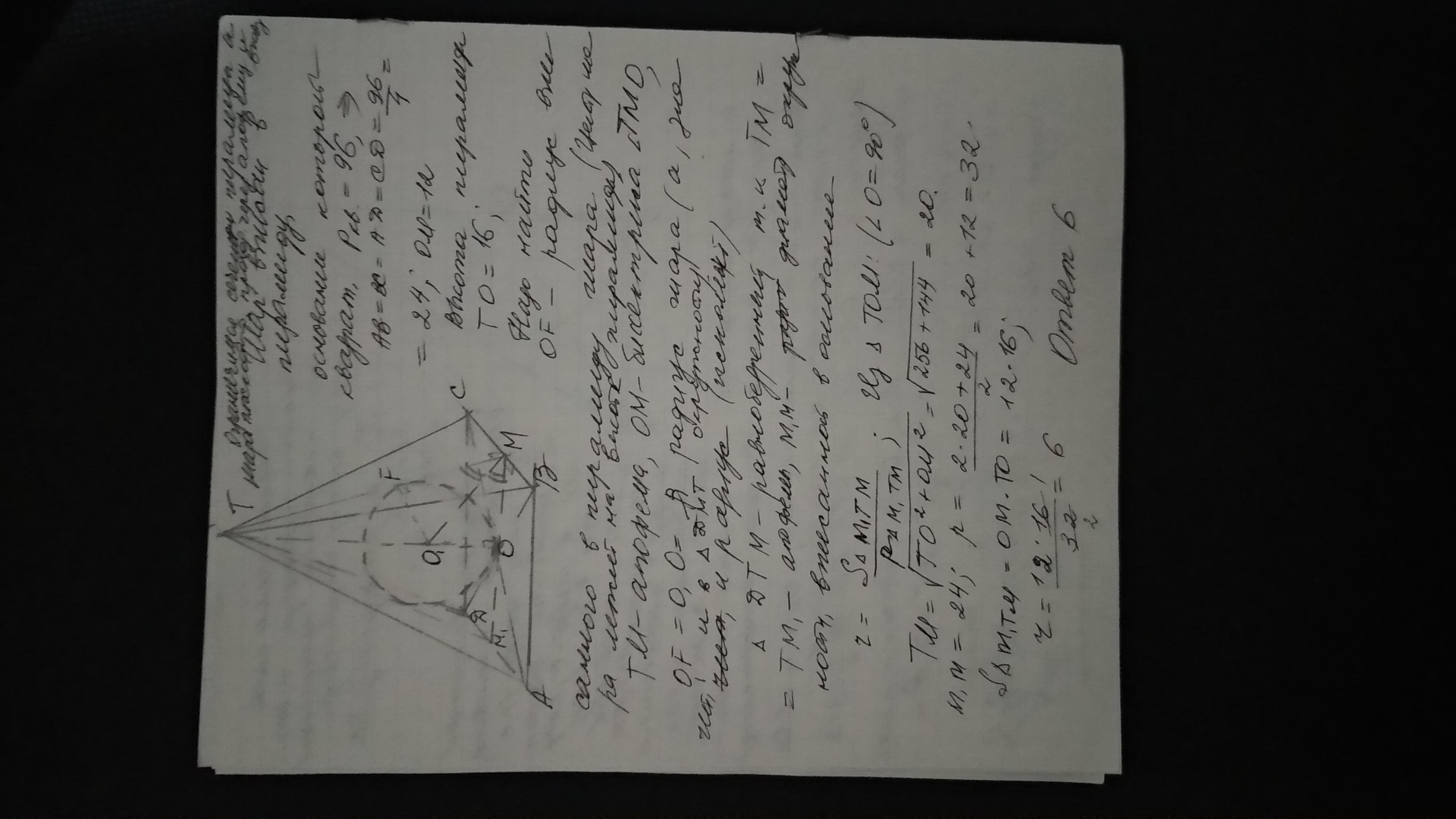 Дана правильная четырёхугольная пирамида, периметр основания которой равен 96. Определите радиус шара, вписанного в пирамиду, если высота пирамиды равна 16.