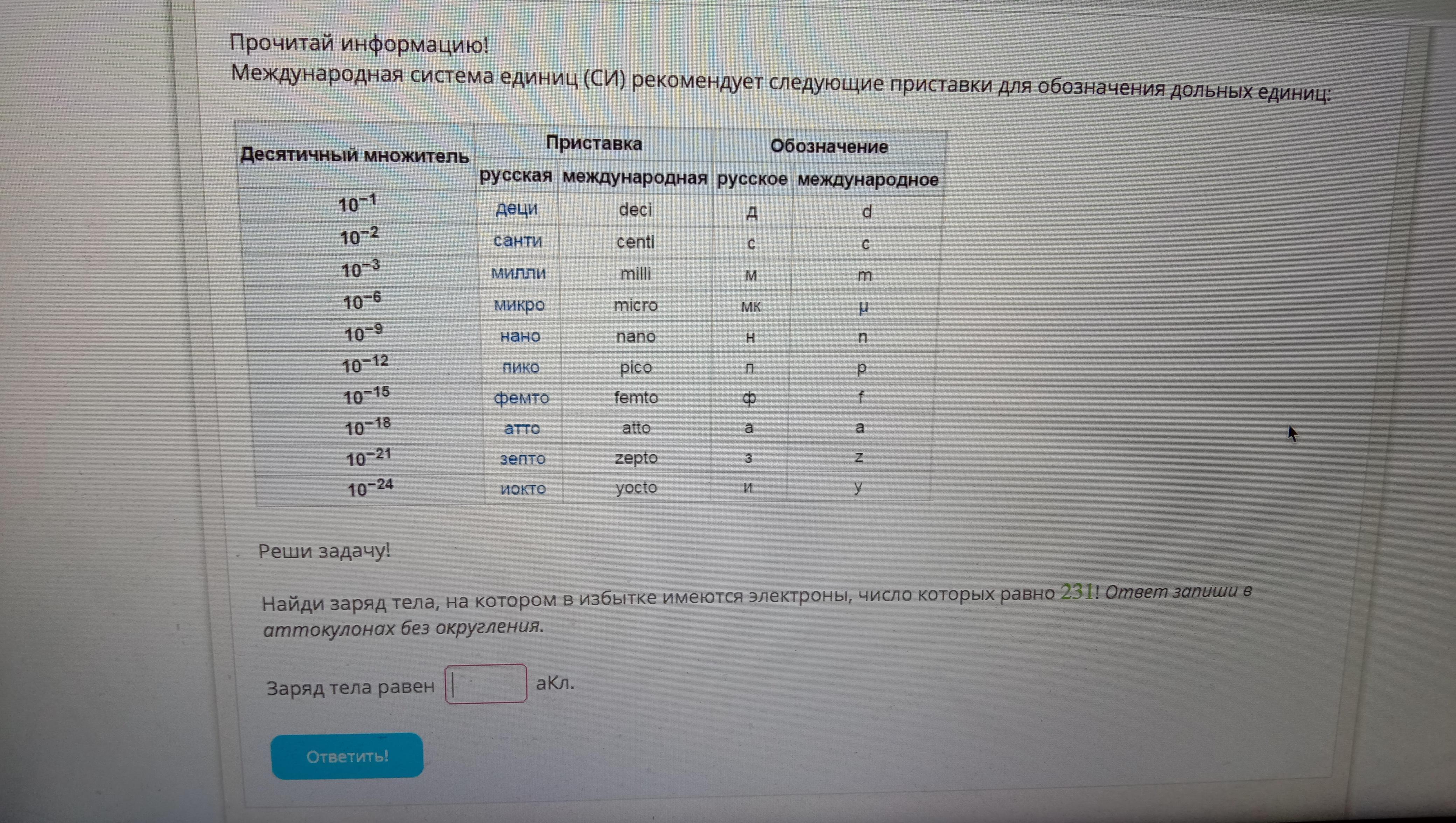 Заряд тела равен аКл,