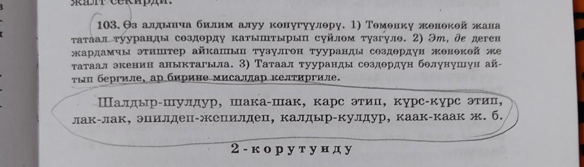 Ал шака-шак кийимдерин жыйнап , тез эле даяр болду . Менин калемим жерге карс этип тушту . Мен коншу жактан курс-курс эткен ундорду уктум . Мен жолду карата лак -лак этип аран басып келе жаттым . Чон энем уйго эпилдеп-жепилдеп кирип келди .Бакыттын келини чараларды калдыр-кулдур эттирип жууп жатты. Досум карганын каак-каак эткен ундорунон чочуп кетти.