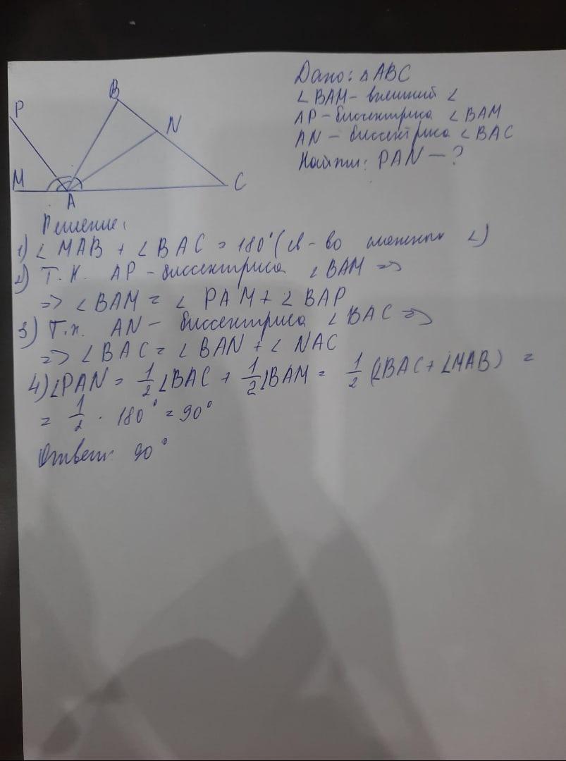 Найдите в градусах угол между биссектрисами внутреннего угла А и внешнего угла А треугольника ABC .