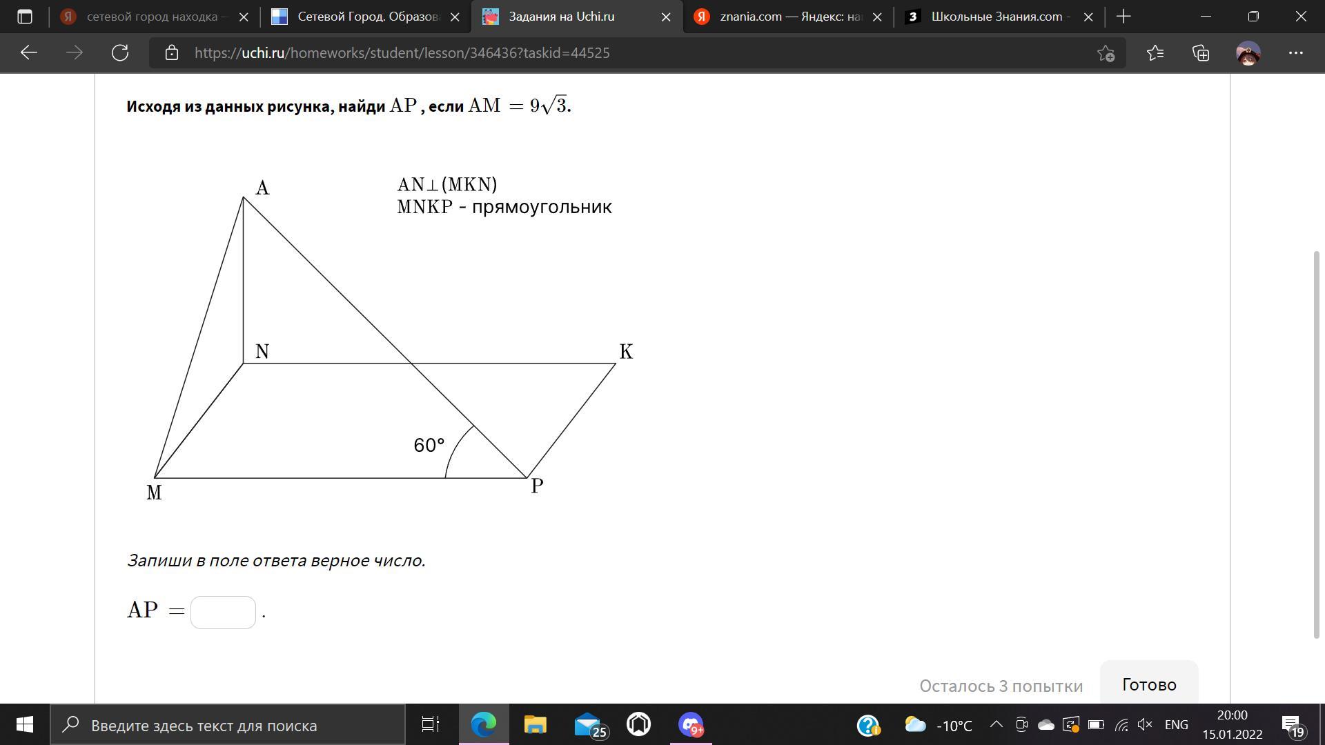 АР=АМ/ sin60°=9√3/√3*2=54