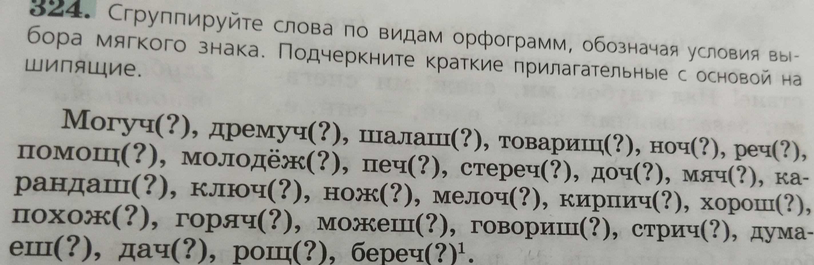 Существительные : шалаш, товарищ, ночь, речь, помощь, молодëж, печь, дочь, мяч, карандаш, ключ, нож, мелочь, кирпич, дач, рощ.