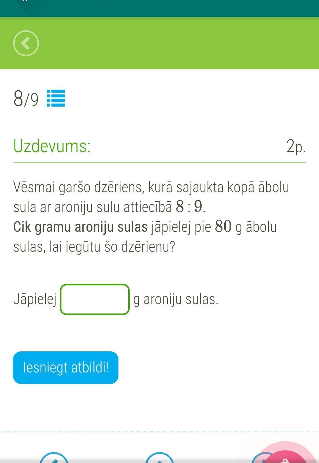 Напиток по вкусу представляет собой смесь яблочного сока и сока аронии в соотношении 8:9. Сколько граммов сока аронии нужно добавить к 80 г яблочного сока, чтобы получился этот напиток?