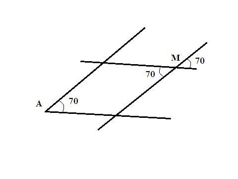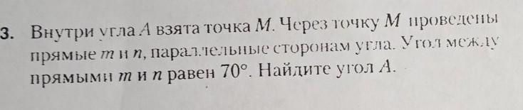 3. Внутри угла А взята точка М. Через точку М проведены прямые m и n, параллельные сторонам угла. Угол между прямыми m и n равен 70°. Найдите угол А.