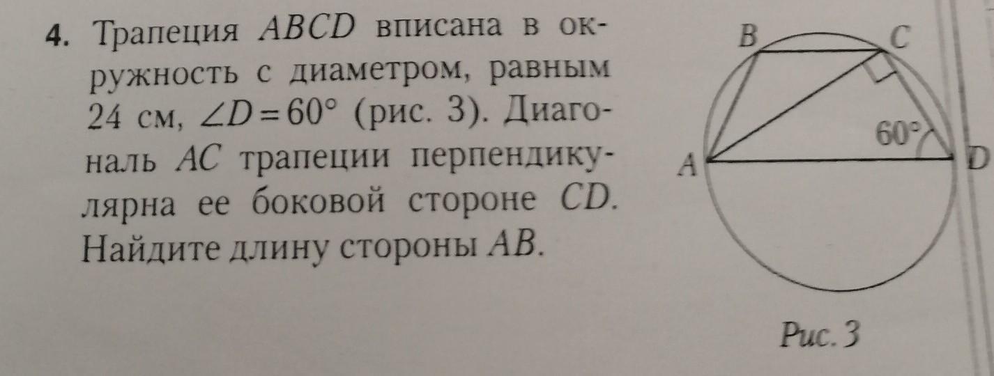 Трапеция ABCD вписана в окружность с диаметром, равным 24 см, D=60°.Диагональ AC трапеции перпендикулярна ее боковой стороне CD. Найти длину стороны AB.