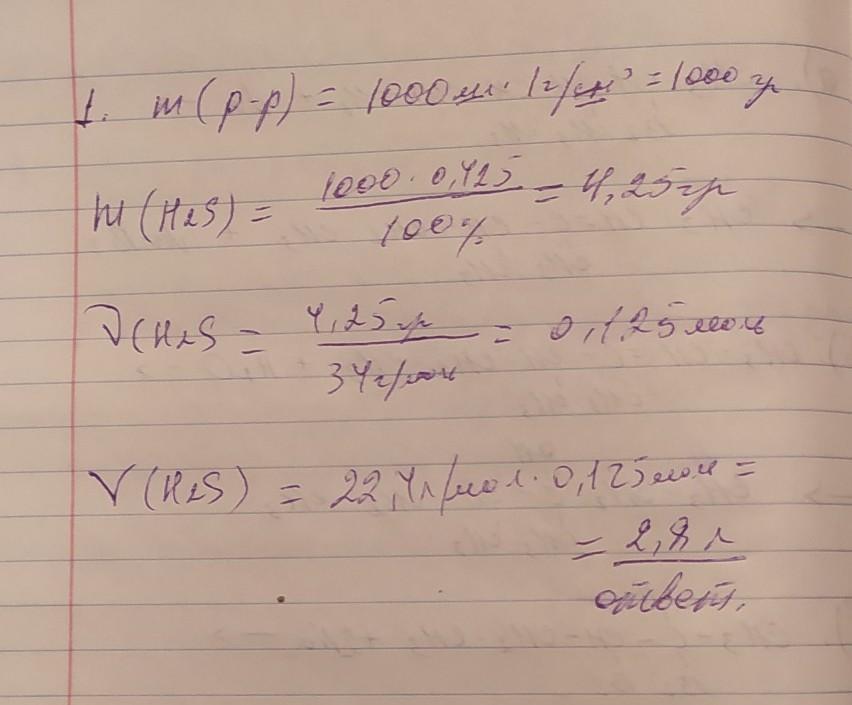 Массовая доля сероводорода в водном растворе H2S при 20°С равна 0,425%.Принимая плотность раствора 1 г/см³, вычислить объем H2S, растворенного в 1 л раствора.